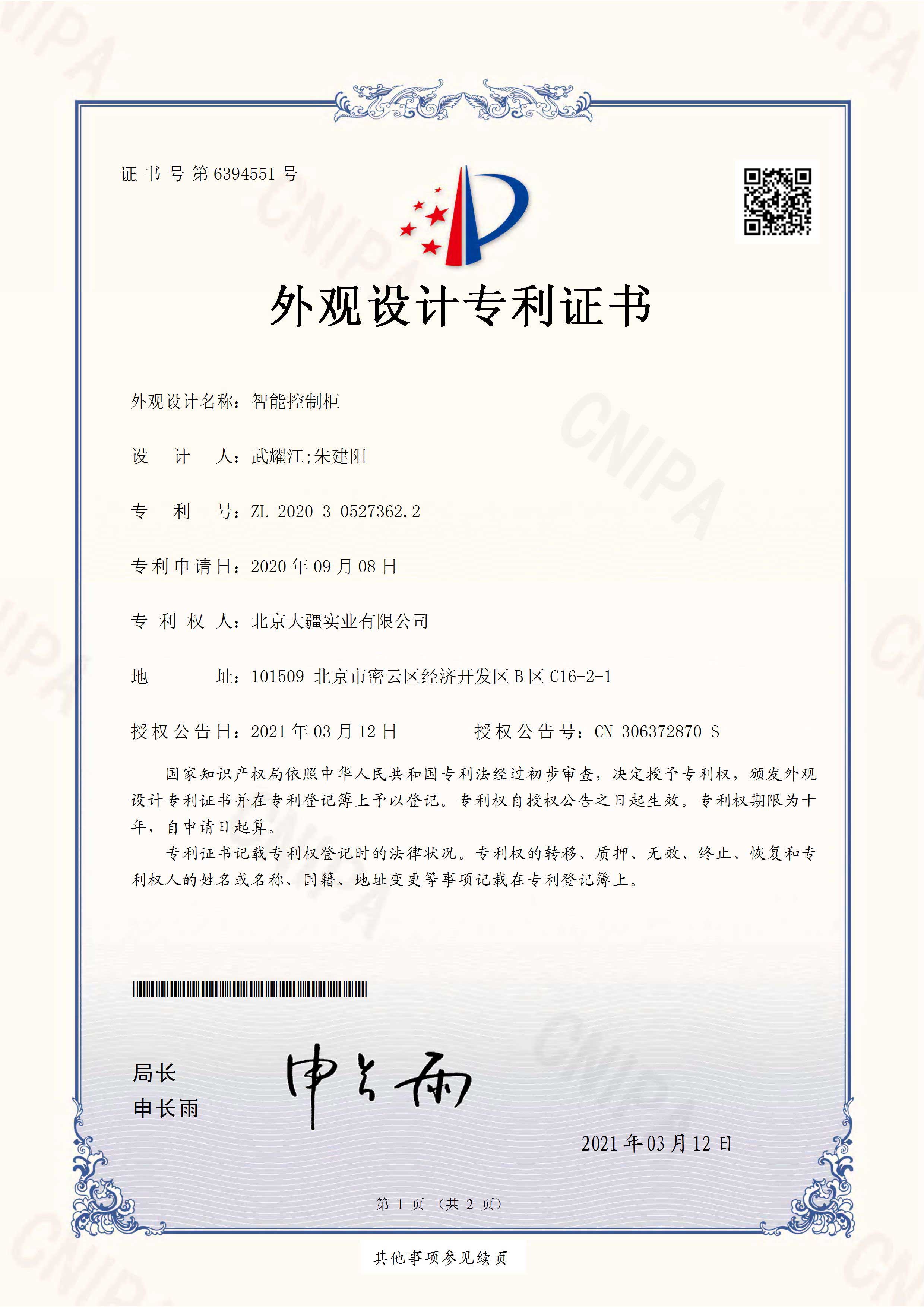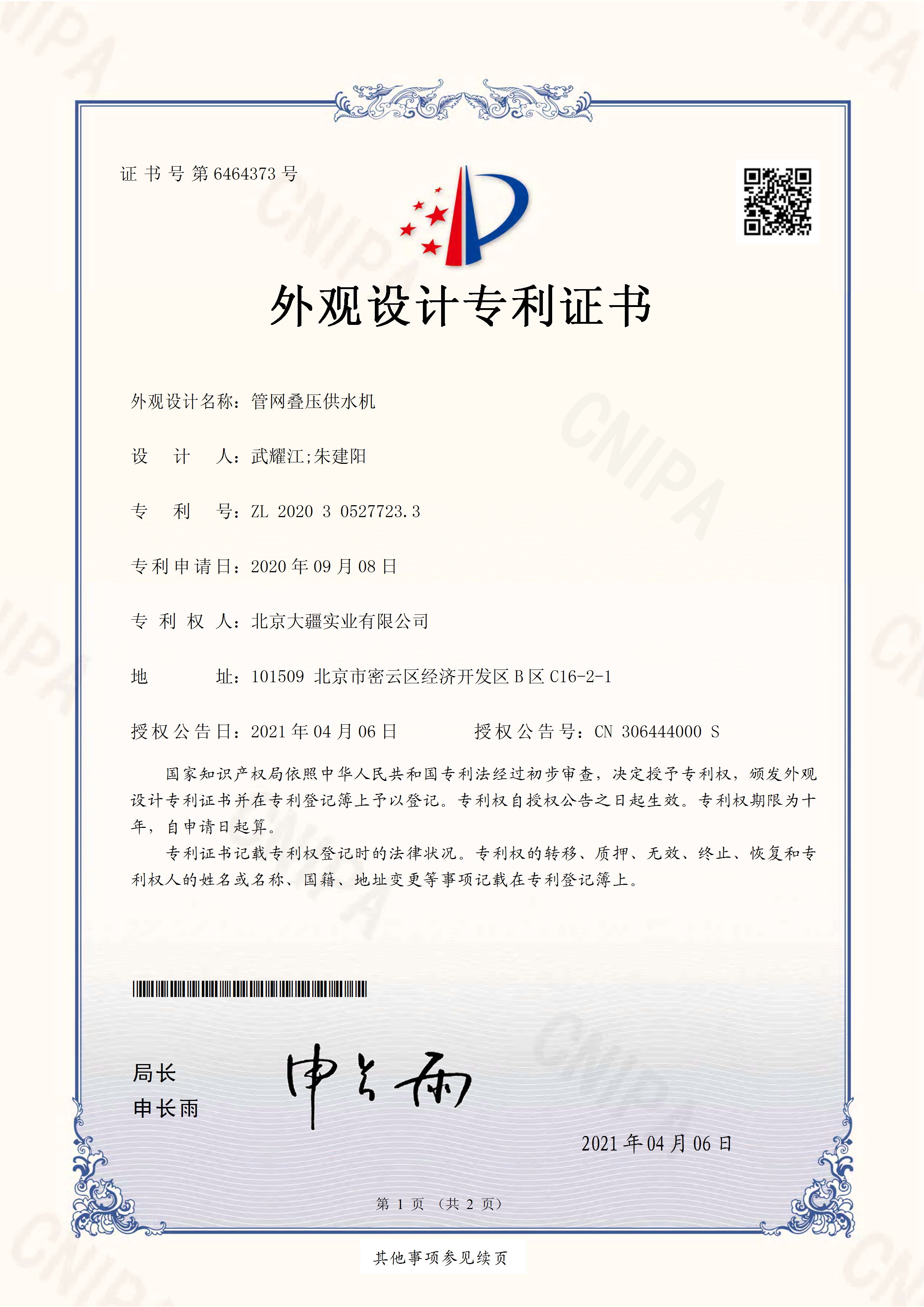 管網(wǎng)疊壓供水機(jī)外觀設(shè)計專利證書