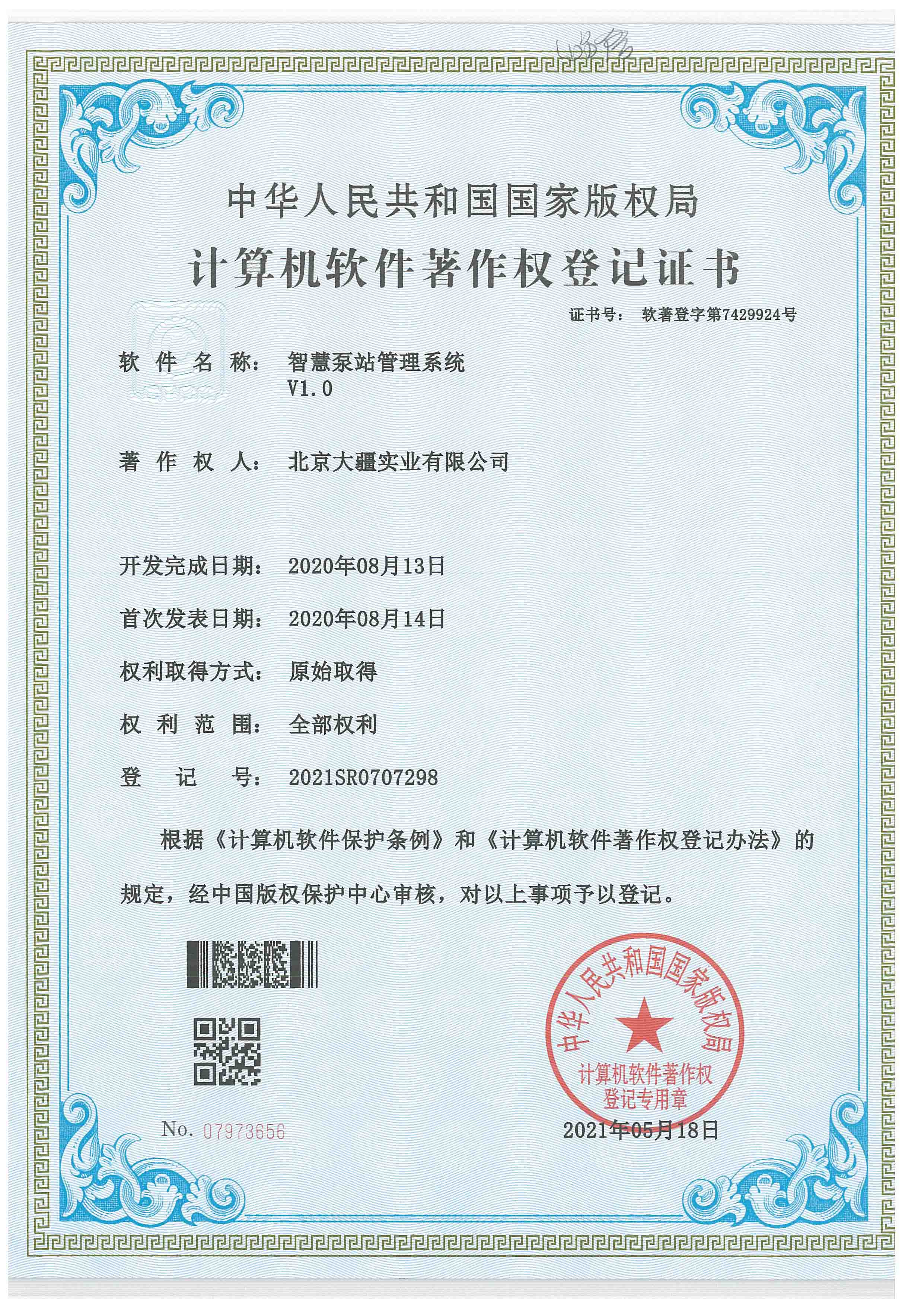 智慧泵站管理系統(tǒng)V1.0軟件著作權(quán)登記證書