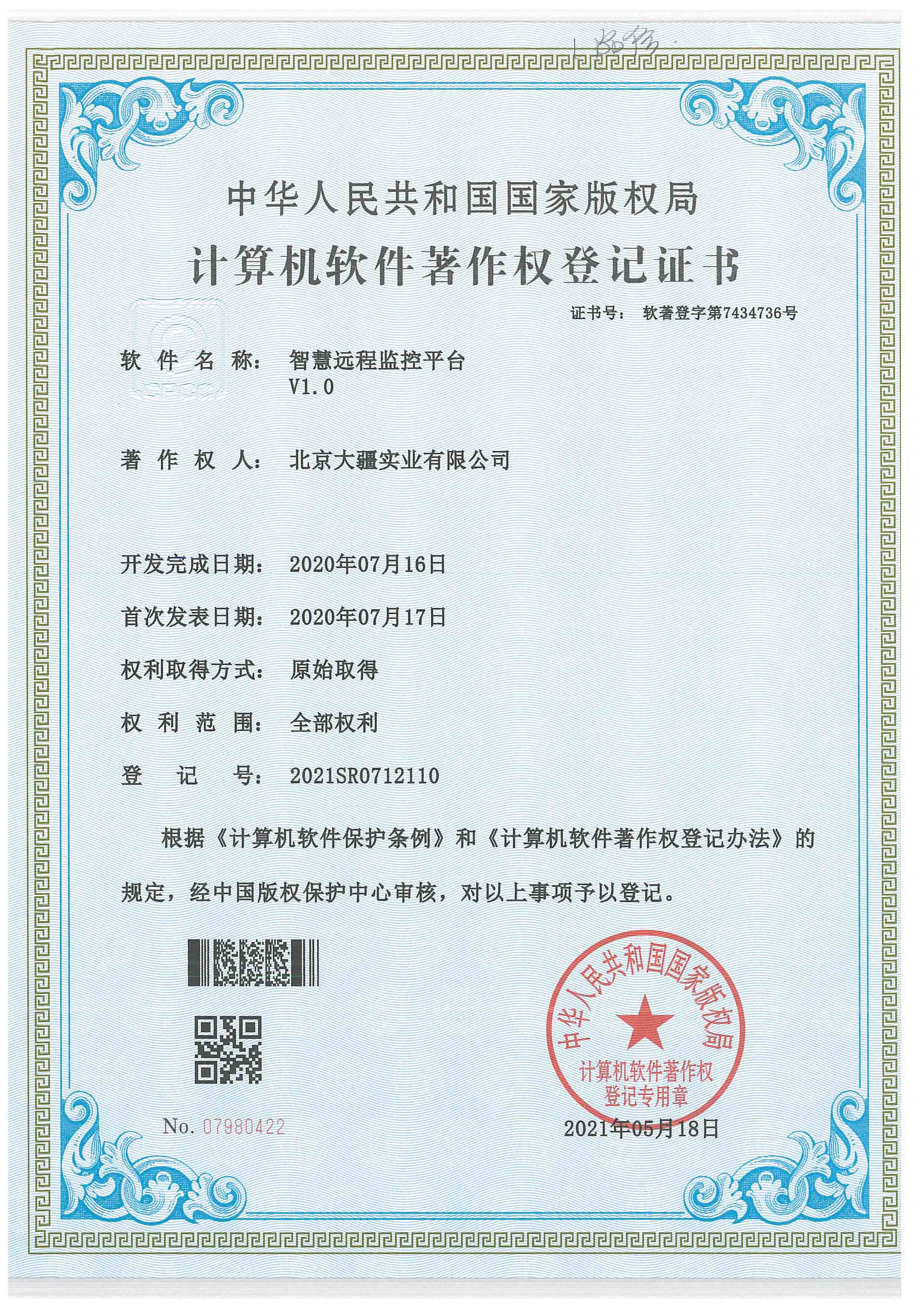 智慧遠(yuǎn)程監(jiān)控平臺V1.0軟件著作權(quán)登記證書