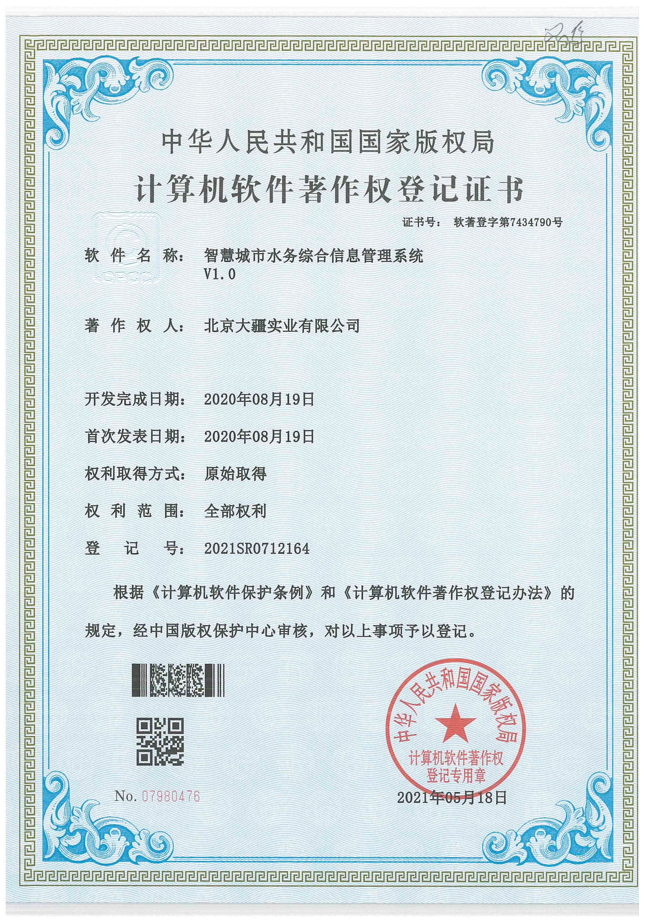 智慧城市水務(wù)綜合信息管理系統(tǒng)V1.0軟件著作權(quán)登記證書