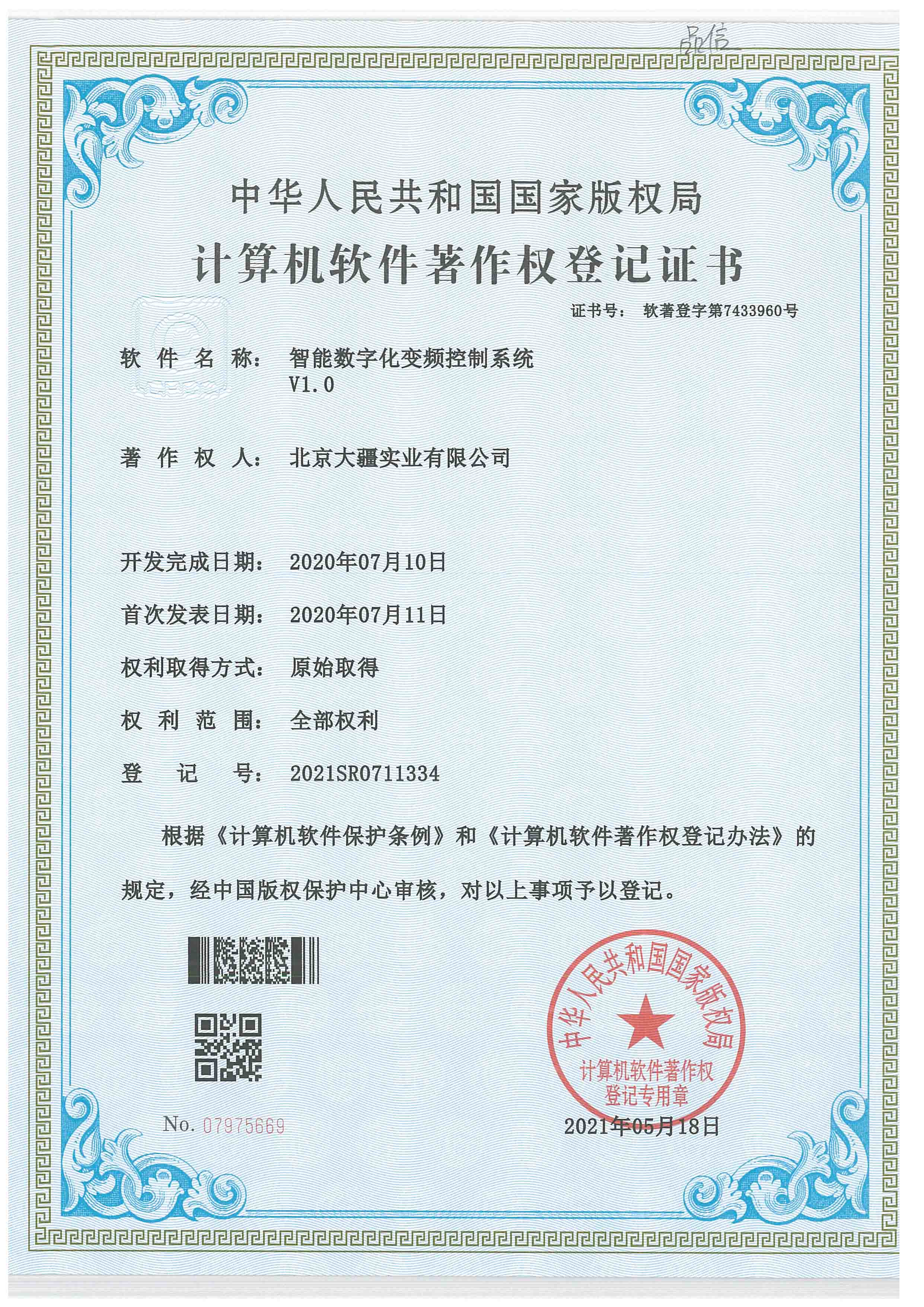 智慧數(shù)字化變頻控制系統(tǒng)V1.0軟件著作權(quán)登記證書