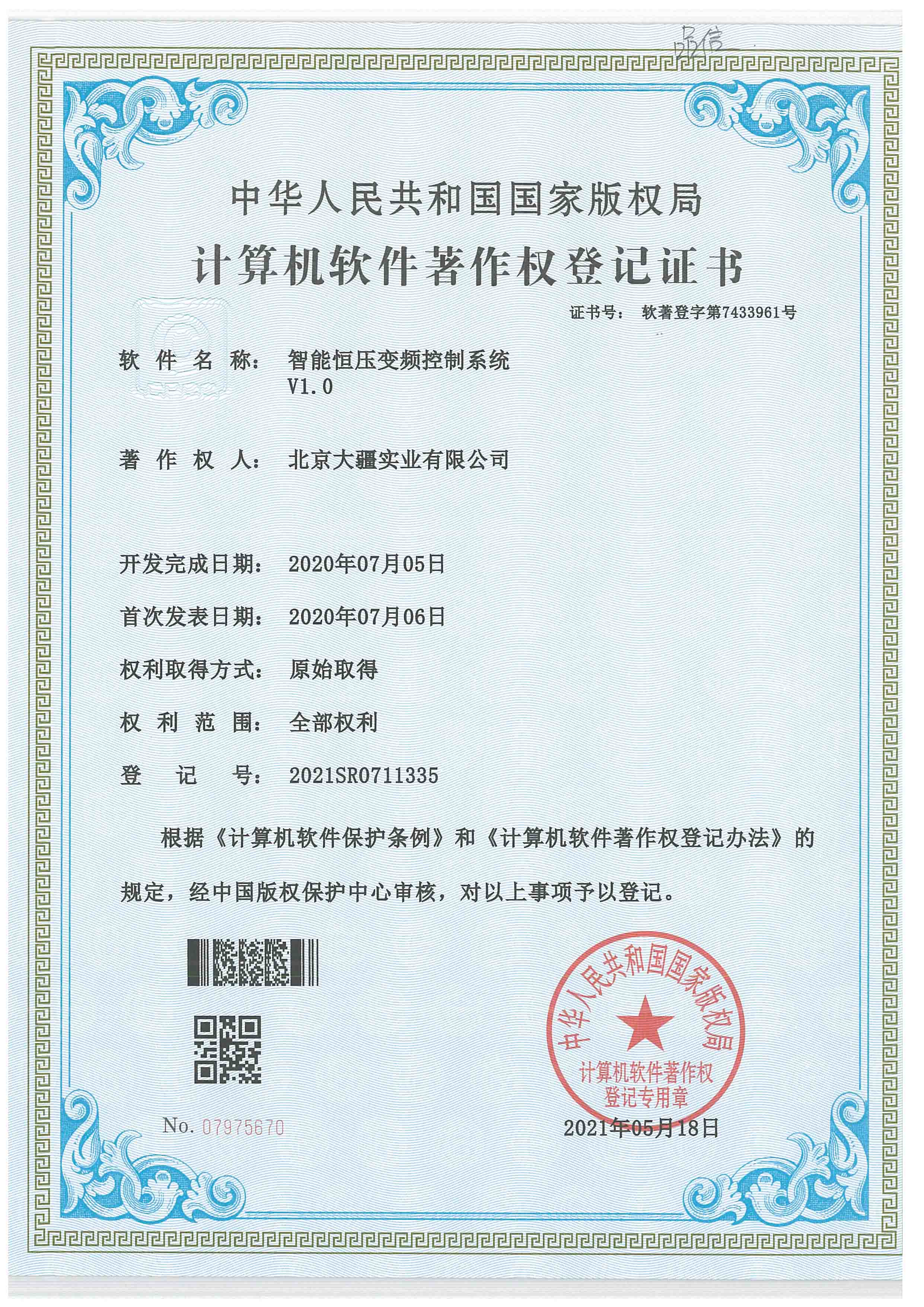 智能恒壓變頻控制系統(tǒng)V1.0軟件著作權(quán)登記證書