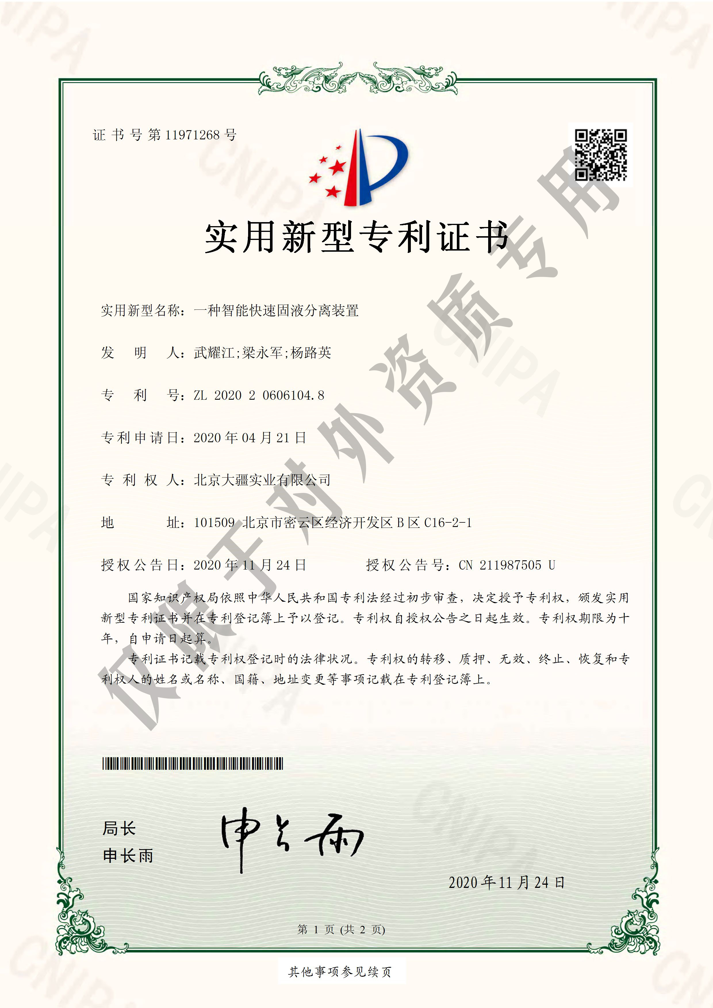 一種裝配式穩(wěn)流補(bǔ)償罐裝置實(shí)用新型專利證書