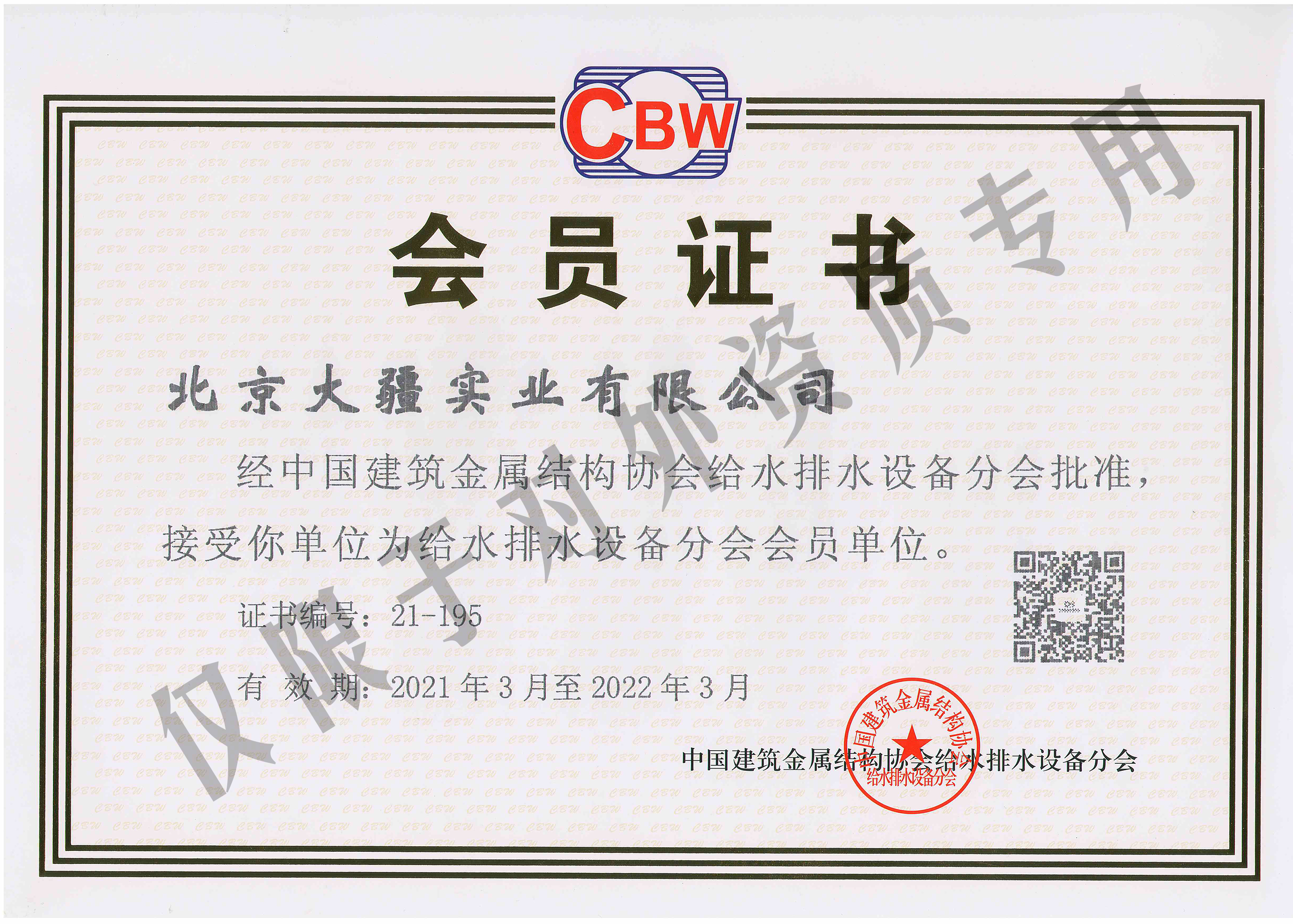 中國建筑金屬結(jié)構(gòu)協(xié)會給排水設(shè)備分會證書