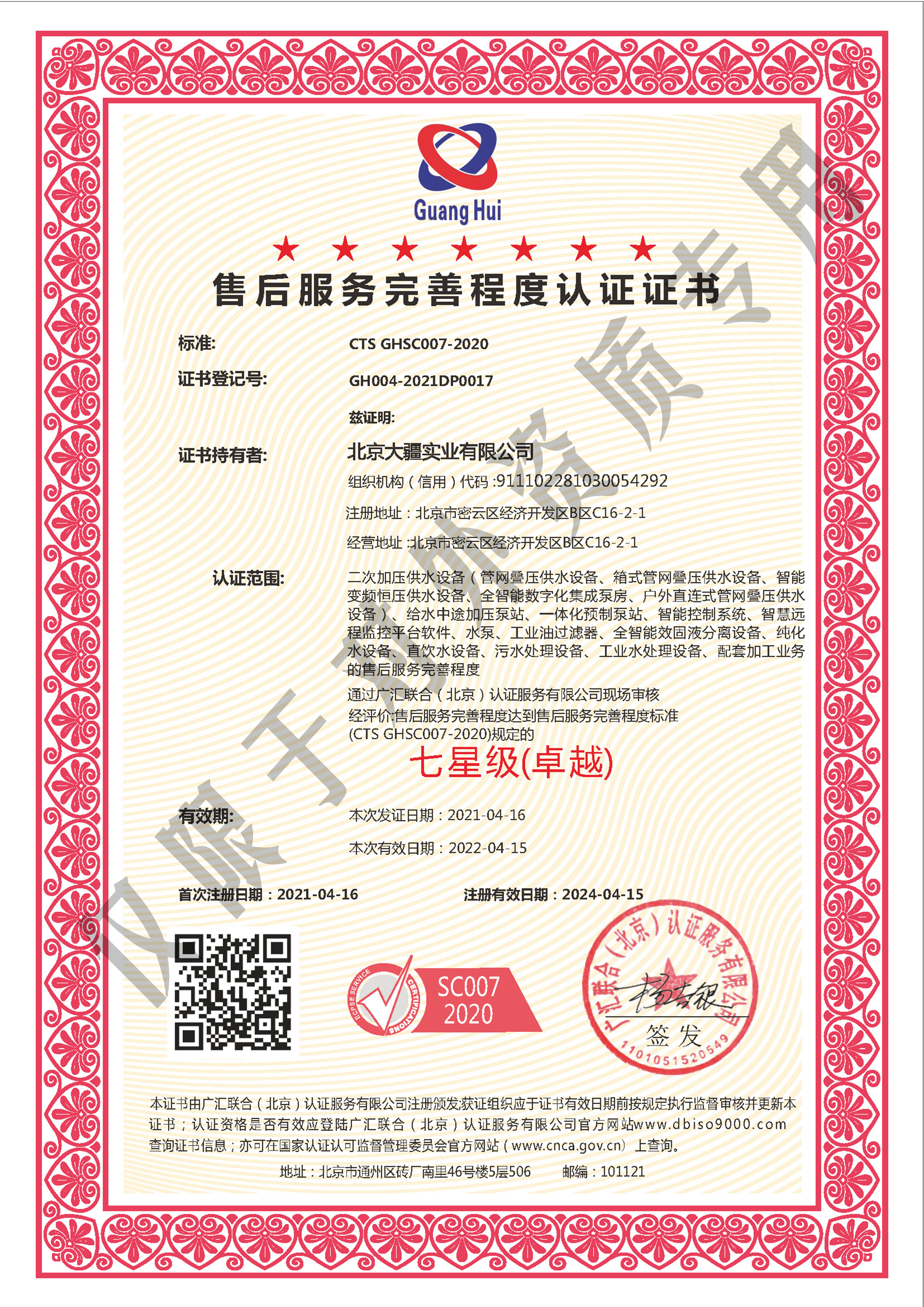售后服務(wù)完善程度認(rèn)證證書七星-中文