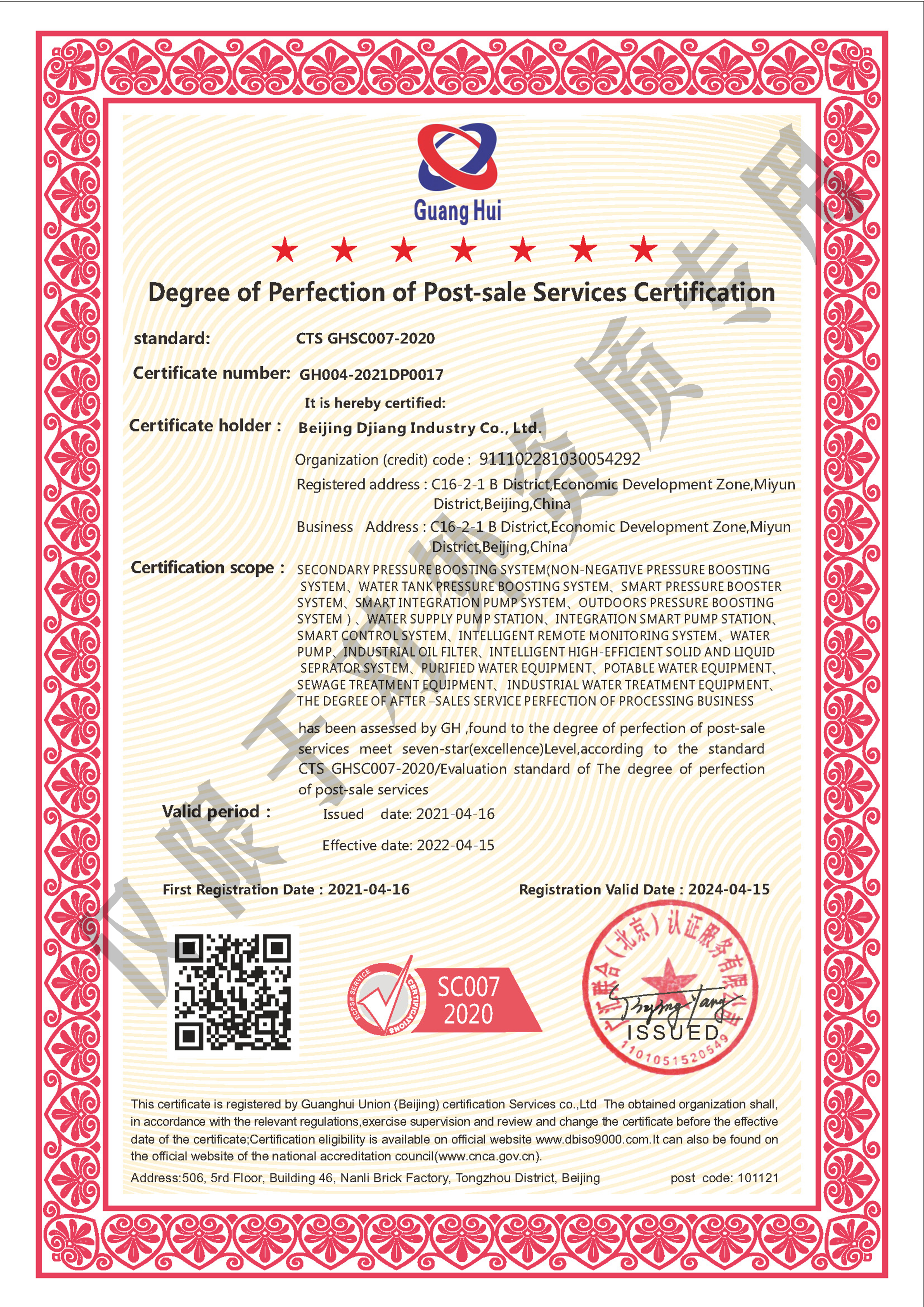 售后服務(wù)完善程度認(rèn)證證書七星-英文